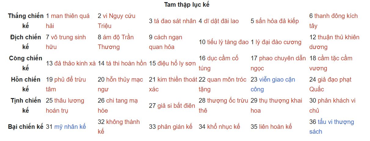 - Liên hoàn kế: Sử dụng nhiều kế liên tiếp, muốn chiến thắng phải biết móc nối nhiều kế với nhau