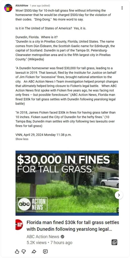 “A Dunedin homeowner was fined $30,000 for tall grass, leading to a lawsuit in 2019. That lawsuit, filed by the Institute for Justice on behalf of Jim Ficken for “excessive” fines, brought national attention to the city. An ABC Action News I-Team investigation helped prompt changes that ultimately helped bring closure to Ficken’s legal battle. When ABC Action News first spoke with Ficken five years ago, he was facing not only fines — but possible foreclosure.” (ABC Action News, Florida man fined $30k for tall grass settles with Dunedin following yearslong legal battle)