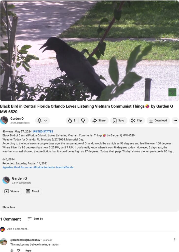 The following video was recorded on Saturday, August 14, 2021. Actually, this video was published on another YT channel years before. It just re-uploaded in Garden Q on May 27, 2024. The guy was talking in the video is Truong Quoc Huy of YouTube channel N10TV. That day, he was livestreaming about Vietnam communist stuffs. Suddenly, a bird stopped by…
