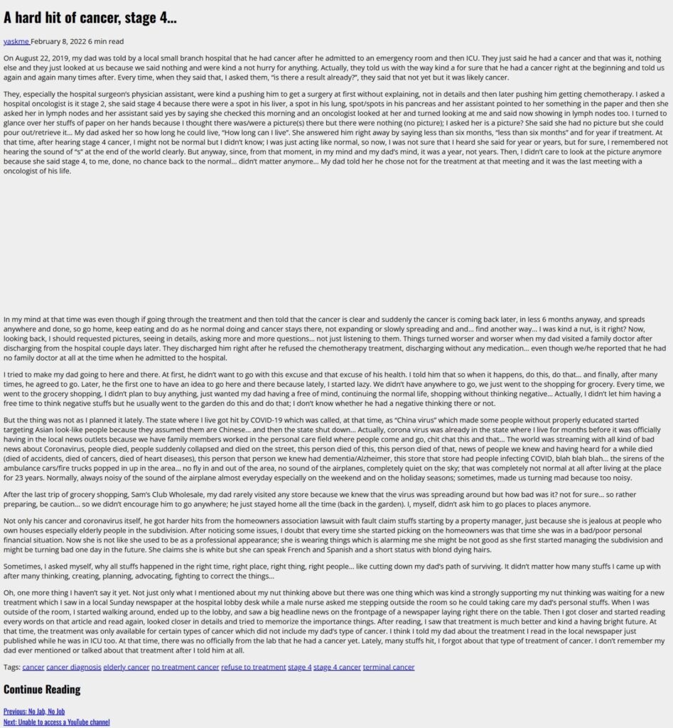 They, especially the hospital surgeon’s physician assistant, were kind a pushing him to get a surgery at first without explaining, not in details and then later pushing him getting chemotherapy. I asked a hospital oncologist is it stage 2, she said stage 4 because there were a spot in his liver, a spot in his lung, spot/spots in his pancreas and her assistant pointed to her something in the paper and then she asked her in lymph nodes and her assistant said yes by saying she checked this morning and an oncologist looked at her and turned looking at me and said now showing in lymph nodes too. I turned to glance over her stuffs of paper on her hands because I thought there was/were a picture(s) there but there were nothing (no picture); I asked her is a picture? She said she had no picture but she could pour out/retrieve it… My dad asked her so how long he could live, “How long can I live”. She answered him right away by saying less than six months, “less than six months” and for year if treatment. At that time, after hearing stage 4 cancer, I might not be normal but I didn’t know; I was just acting like normal, so now, I was not sure that I heard she said for year or years, but for sure, I remembered not hearing the sound of “s” at the end of the world clearly. But anyway, since, from that moment, in my mind and my dad’s mind, it was a year, not years. Then, I didn’t care to look at the picture anymore because she said stage 4, to me, done, no chance back to the normal… didn’t matter anymore… My dad told her he chose not for the treatment at that meeting and it was the last meeting with a oncologist of his life.