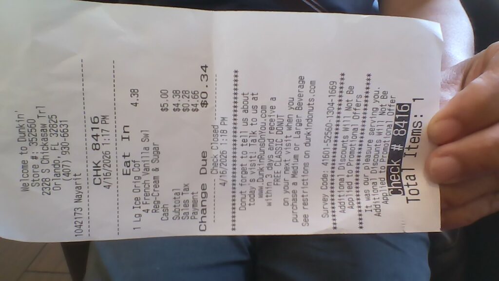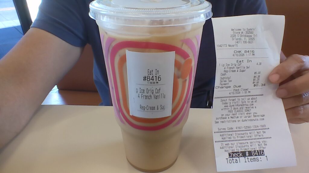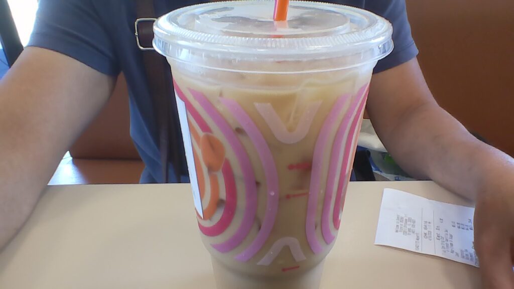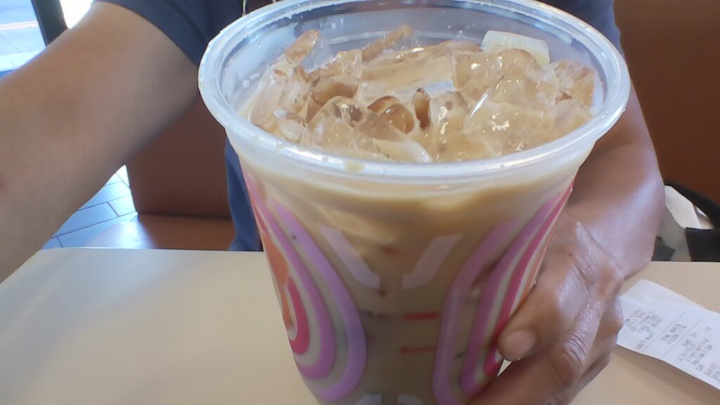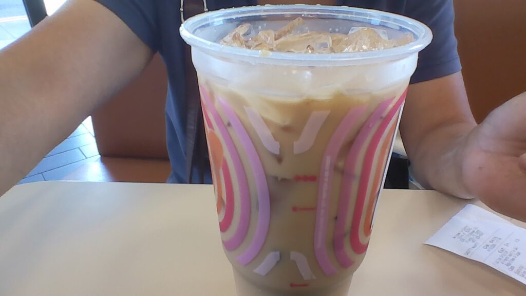 Cà phê đá này có cho cream (kem?), va ni (Pháp) và đường. Dunken Donut họ bán đó. Cái ly này là loại ly lớn, có giá là $4.38.