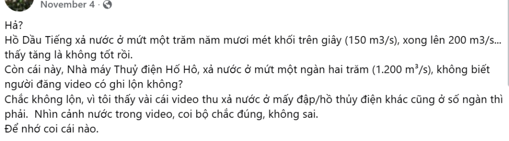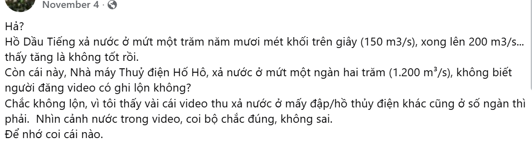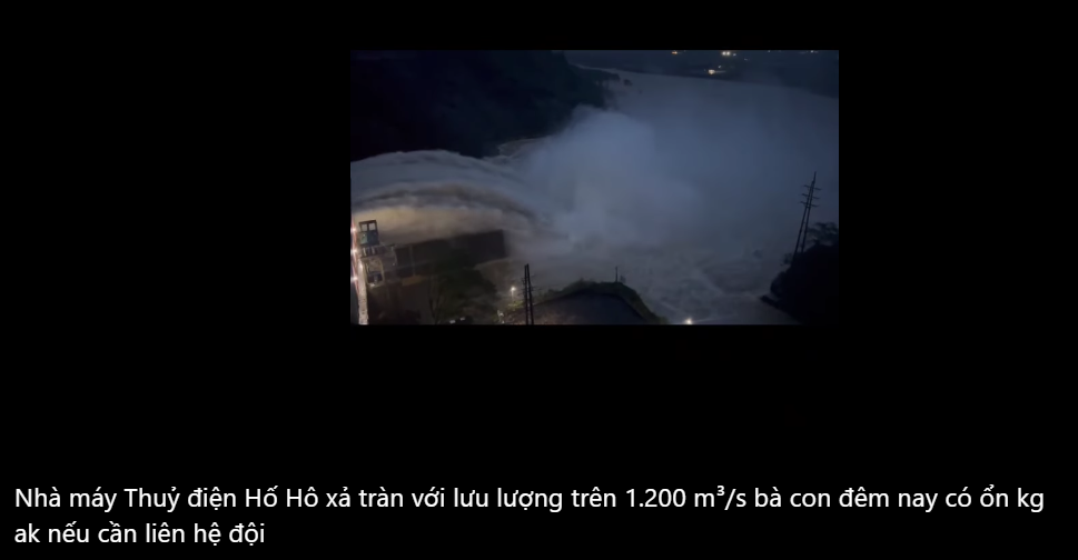 Còn cái này, Nhà máy Thuỷ điện Hố Hô, xả nước ở mứt một ngàn hai trăm (1.200 m³/s), không biết người đăng video có ghi lộn không?