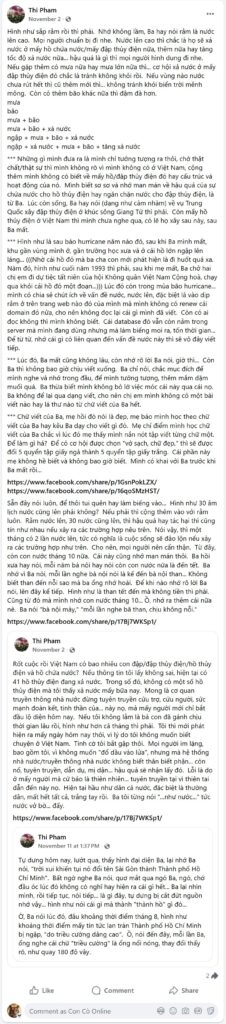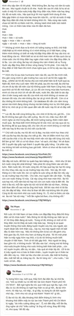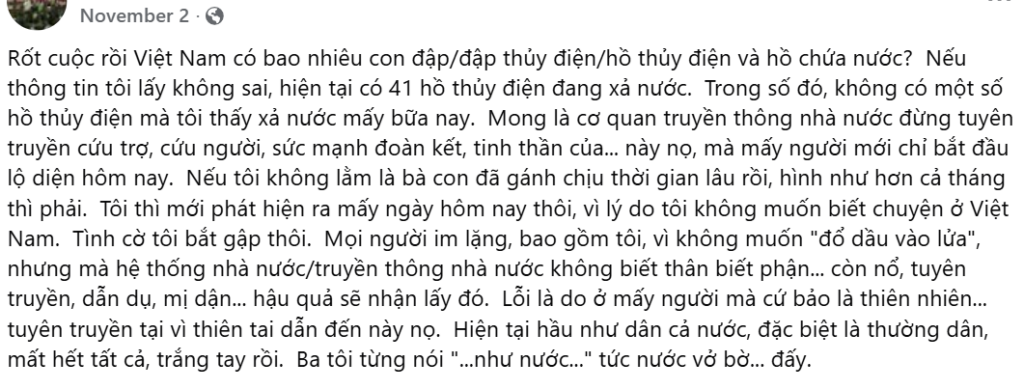 Rốt cuộc rồi Việt Nam có bao nhiêu con đập/đập thủy điện/hồ thủy điện và hồ chứa nước? Nếu thông tin tôi lấy không sai, hiện tại có 41 hồ thủy điện đang xả nước. Trong số đó, không có một số hồ thủy điện mà tôi thấy xả nước mấy bữa nay. Mong là cơ quan truyền thông nhà nước đừng tuyên truyền cứu trợ, cứu người, sức mạnh đoàn kết, tinh thần của… này nọ, mà mấy người mới chỉ bắt đầu lộ diện hôm nay. Nếu tôi không lằm là bà con đã gánh chịu thời gian lâu rồi, hình như hơn cả tháng thì phải. Tôi thì mới phát hiện ra mấy ngày hôm nay thôi, vì lý do tôi không muốn biết chuyện ở Việt Nam. Tình cờ tôi bắt gập thôi. Mọi người im lặng, bao gồm tôi, vì không muốn “đổ dầu vào lửa”, nhưng mà hệ thống nhà nước/truyền thông nhà nước không biết thân biết phận… còn nổ, tuyên truyền, dẫn dụ, mị dận… hậu quả sẽ nhận lấy đó. Lỗi là do ở mấy người mà cứ bảo là thiên nhiên… tuyên truyền tại vì thiên tai dẫn đến này nọ. Hiện tại hầu như dân cả nước, đặc biệt là thường dân, mất hết tất cả, trắng tay rồi. Ba tôi từng nói “…như nước…” tức nước vở bờ… đấy.