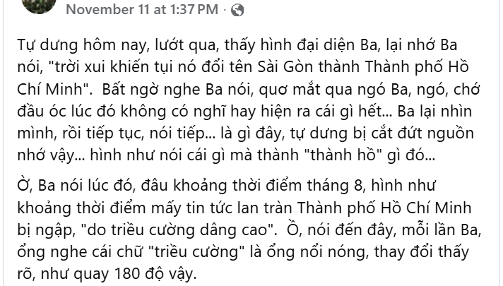 Tự dưng hôm nay, lướt qua, thấy hình đại diện Ba, lại nhớ Ba nói, “trời xui khiến tụi nó đổi tên Sài Gòn thành Thành phố Hồ Chí Minh”. Bất ngờ nghe Ba nói, quơ mắt qua ngó Ba, ngó, chớ đầu óc lúc đó không có nghĩ hay hiện ra cái gì hết… Ba lại nhìn mình, rồi tiếp tục, nói tiếp… là gì đây, tự dưng bị cắt đứt nguồn nhớ vậy… hình như nói cái gì mà thành “thành hồ” gì đó…