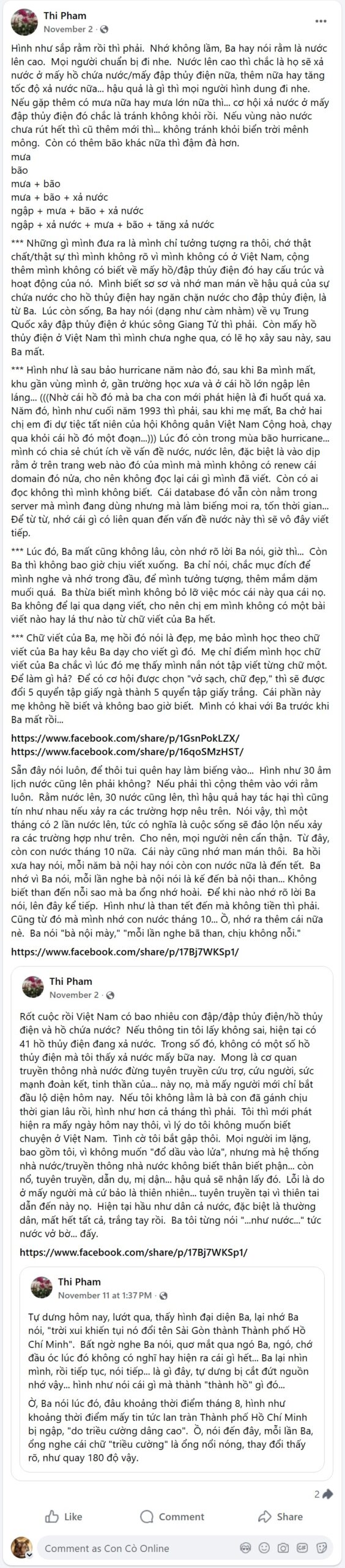 *** Những gì mình đưa ra là mình chỉ tưởng tượng ra thôi, chớ thật chất/thật sự thì mình không rõ vì mình không có ở Việt Nam, cộng thêm mình không có biết về mấy hồ/đập thủy điện đó hay cấu trúc và hoạt động của nó. Mình biết sơ sơ và nhớ man mán về hậu quả của sự chứa nước cho hồ thủy điện hay ngăn chặn nước cho đập thủy điện, là từ Ba. Lúc còn sống, Ba hay nói (dạng như càm nhàm) về vụ Trung Quốc xây đập thủy điện ở khúc sông Giang Tử thì phải. Còn mấy hồ thủy điện ở Việt Nam thì mình chưa nghe qua, có lẽ họ xây sau này, sau Ba mất.