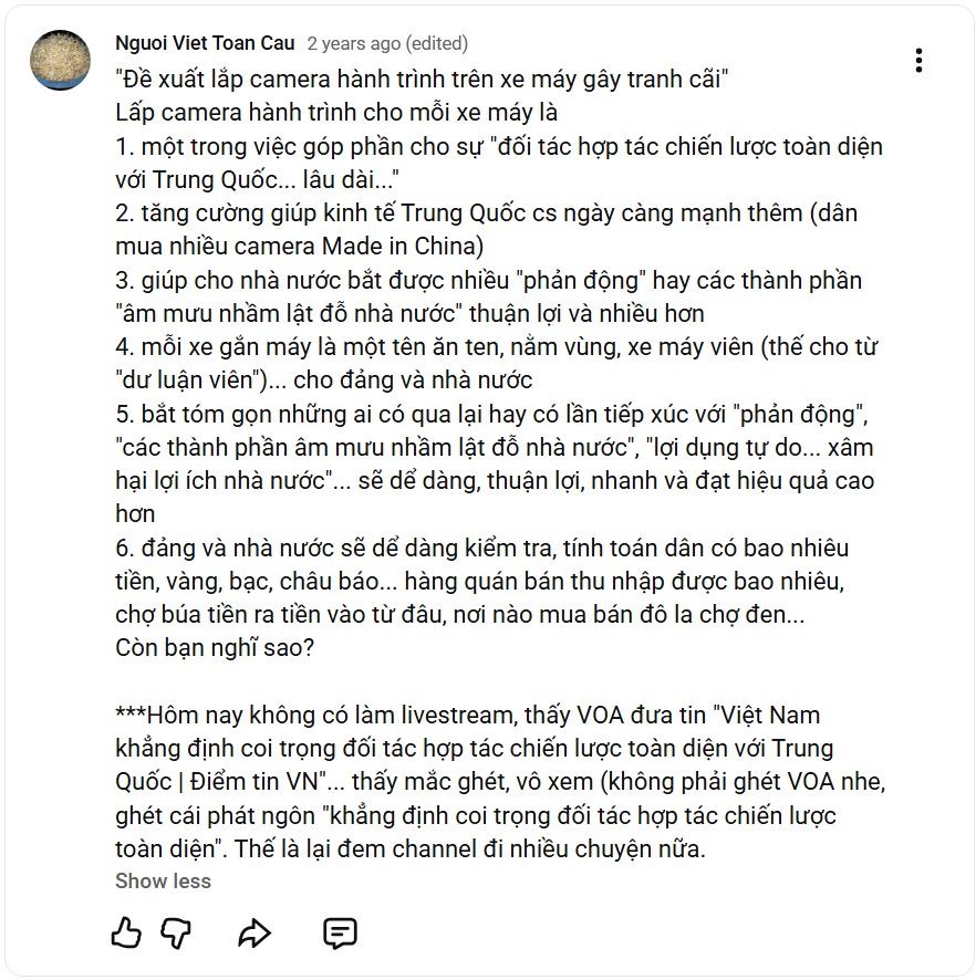 ***Hôm nay không có làm livestream, thấy VOA đưa tin “Việt Nam khẳng định coi trọng đối tác hợp tác chiến lược toàn diện với Trung Quốc | Điểm tin VN”… thấy mắc ghét, vô xem (không phải ghét VOA nhe, ghét cái phát ngôn “khẳng định coi trọng đối tác hợp tác chiến lược toàn diện”. Thế là lại đem channel đi nhiều chuyện nữa.