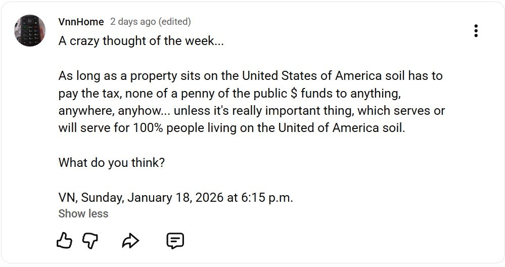 As long as a property which sits on the United States of America soil still has to pay the tax, not a single penny of the public $ funds to anything, anywhere, anyhow… unless it’s a really important thing, which serves or will serve for/to 100% people who living on the United of America soil.