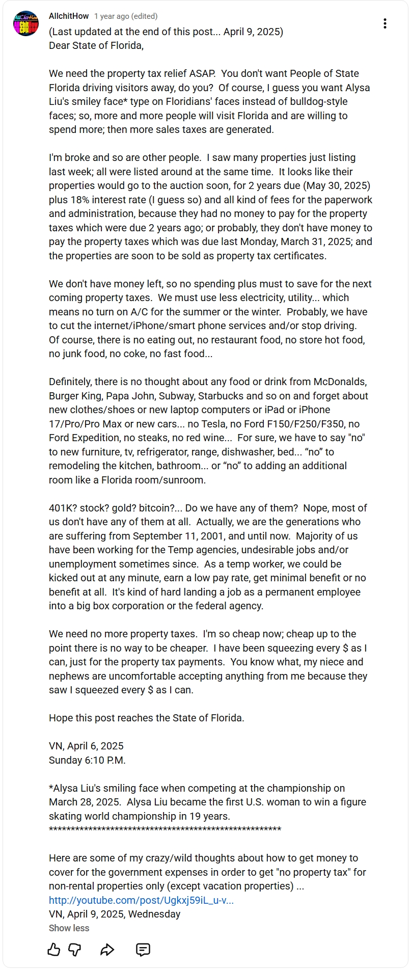 (Last updated at the end of this post… April 9, 2025)Dear State of Florida, We need the property tax relief ASAP. You don’t want People of State Florida driving visitors away, do you? Of course, I guess you want Alysa Liu’s smiley face* type on Floridians’ faces instead of bulldog-style faces; so, more and more … Continue reading Dear State of Florida