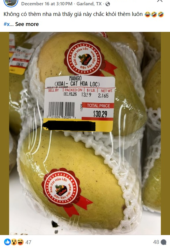 Nói vậy chớ bà con Việt cũng ngộ lắm. Mặc dầu xoài Florida có ngon hơn gấp mấy lần đi chăng, họ cũng nghĩ và eager xoài nhập từ Việt Nam hà, mà chợ [bao gồm tiểu thương online] thì bán trên trời dưới đất…