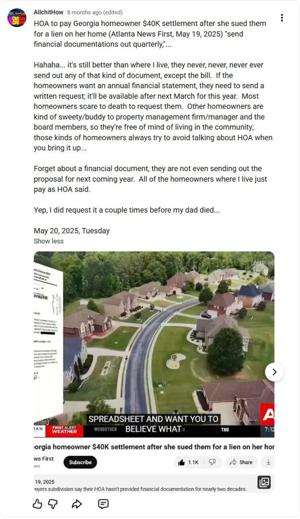 HOA to pay Georgia homeowner $40K settlement after she sued them for a lien on her home (Atlanta News First, May 19, 2025) “send financial documentations out quarterly,”…