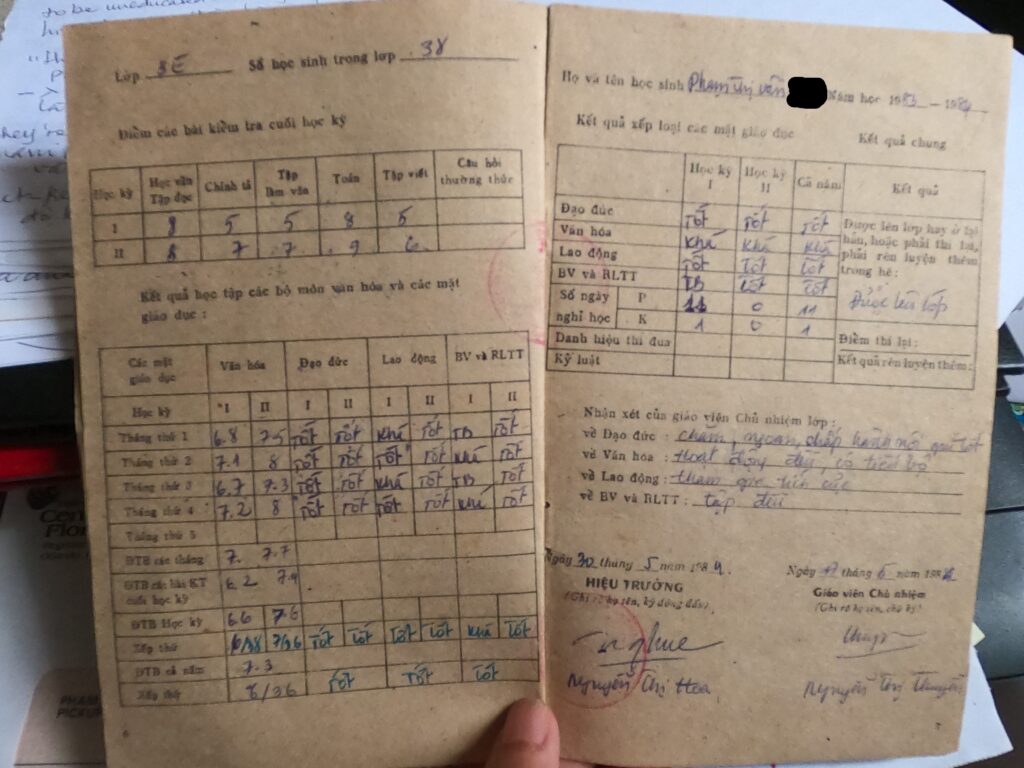 Đập vào mắt tui, 11 ngày nghỉ có phép, sau tui chẳng nhớ gì. Không những vậy mà còn nhớ mình không có nghỉ học ngày nào nữa thì khác. Lúc này họ thả Ba ra rồi, tui về vườn ở với Ba và em, không còn ở trên chợ với ông ngoại nữa, nhưng vẫn đi học đều đều. Nhớ là mình chẳng hề bệnh hoạn gì cả, vả lại dể dầu gì Ba để cho nghỉ học nữa ở đó chớ nói gì nghỉ nhiều ngày đến thế. Hồi đó tới giờ chưa bao giờ nhìn kỷ học bạ của mình cả. Từ khi mẹ lấy nó về để đi Mỹ thì nó mới ở với gia đình tui nhưng tui không có xem nó bao giờ đâu. Còn lúc đi học thì chỉ được xem học bạ sơ qua thôi, mà lúc đó cũng chẳng hiểu gì mà coi, nhìn nó như đám rừng, rồi quay nhìn đứa kế bên, đứa kế bên cũng quơ mắt nhìn quanh, thế là cứ nhìn theo cô giáo… Không phải năm nào cũng được nhìn thấy học bạ, chỉ được thấy có một hay hai lần, hồi lúc còn học cấp một, đúng ra là có một lần thôi. Cô giáo phát ra cho xem bằng cách phát ra cho từng đứa. Đến khi cô giáo phát cho đứa cuối cùng ở bàn chót, xong cô giáo quay lại đầu bàn nhất, thu lại học bạ, cho nên có muốn xem cũng không biết xem gì, vả lại có thấy cái học bạ hay nghe nói tới nó bao giờ đâu mà có ấn tượng trong đó có gì mà nhìn hay nhìn nhanh qua được.