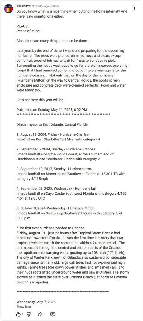 Last year, by the end of June, I was done preparing for the upcoming hurricane. The trees were pruned, trimmed, neat and clean, except some fruit trees which had to wait for fruits to be ready to pick. Surrounding the house was ready to go for the storm, except one thing I forgot that I had removed something out of there a year ago, after the hurricane season…. Not only that, on the day of the hurricane (Hurricane Milton) on the way to Central Florida, the pool’s screen enclosure and concrete deck were cleaned perfectly. Food and water were ready too.