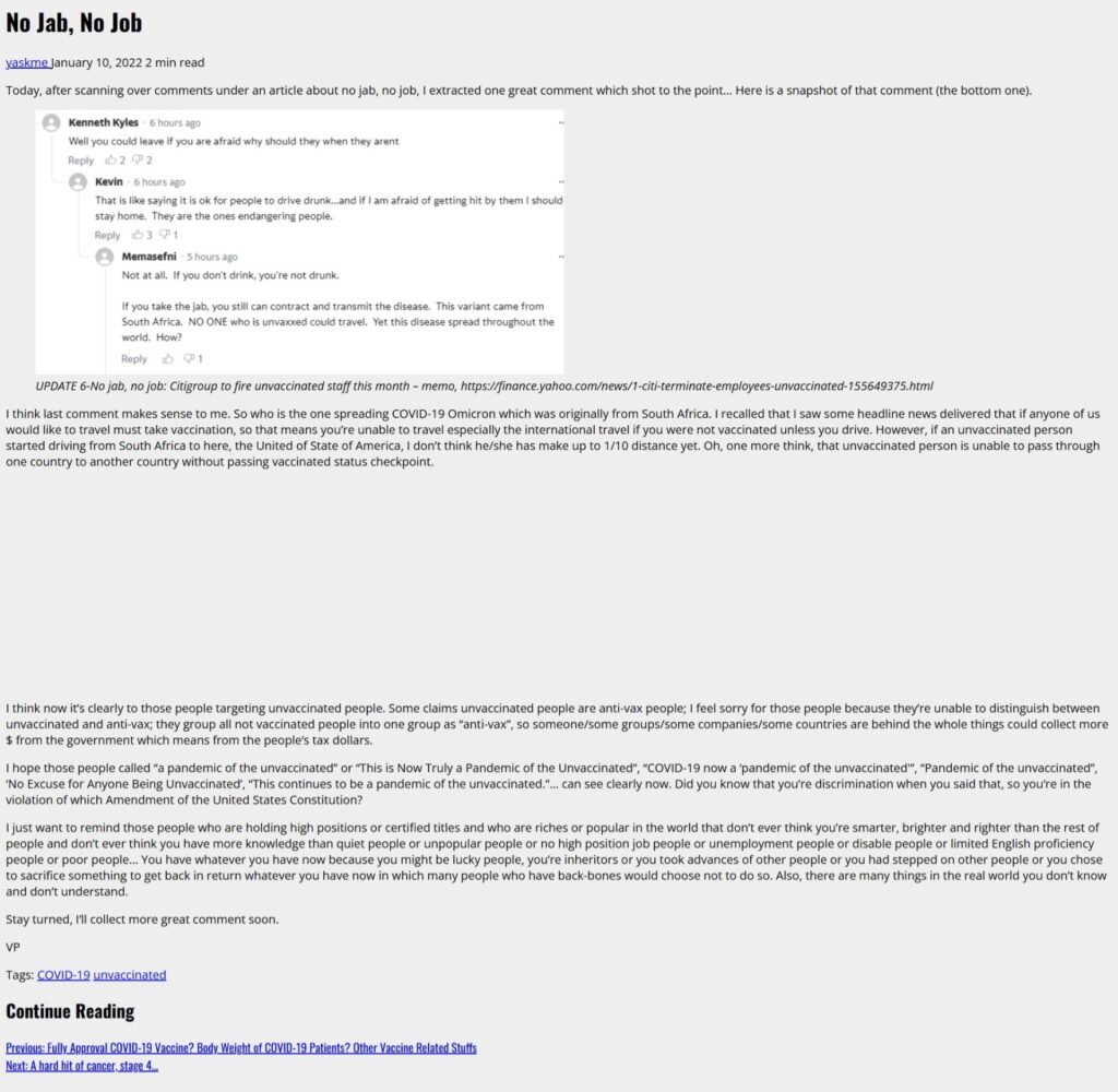 I think last comment makes sense to me. So who is the one spreading COVID-19 Omicron which was originally from South Africa. I recalled that I saw some headline news delivered that if anyone of us would like to travel must take vaccination, so that means you’re unable to travel especially the international travel if you were not vaccinated unless you drive. However, if an unvaccinated person started driving from South Africa to here, the United of State of America, I don’t think he/she has make up to 1/10 distance yet. Oh, one more think, that unvaccinated person is unable to pass through one country to another country without passing vaccinated status checkpoint.