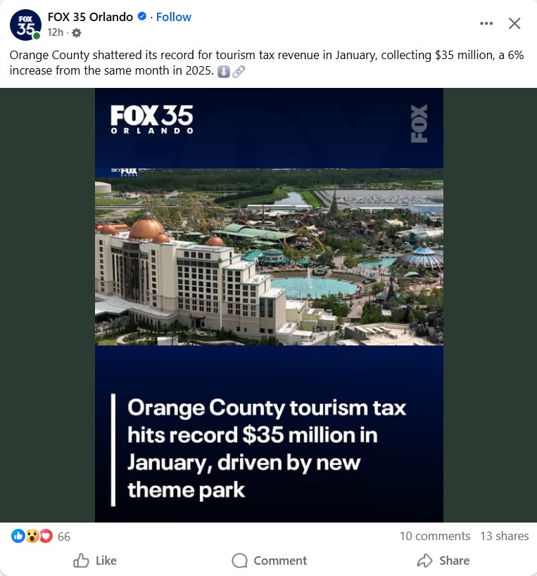 “Orange County shattered its record for tourism tax revenue in January, collecting $35 million, a 6% increase from the same month in 2025”