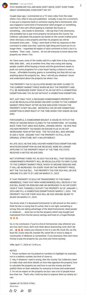 Couple days ago, I commented on a TV news video from the state where I live, when it was just published. Actually, it was not a comment; it was just a response back to someone saying that a homeowner, who was trapped in some kind of homeowner relief program or something, said that if she can’t afford paying to maintain the house or something… she needs to downsize. I did say that if she downsizes, she probably has to pay more property tax because the County Tax Collector calculates the property tax based on the current market price when she buys a new property and then its property tax will be increased every year… Today, I went back to find my response to that comment to make sure that I said the right thing and found out it’s no longer there. I expanded all replies of each comment to find it, but it is nowhere. Then I said… Humm… let me tell everyone to know about the property tax where I live.