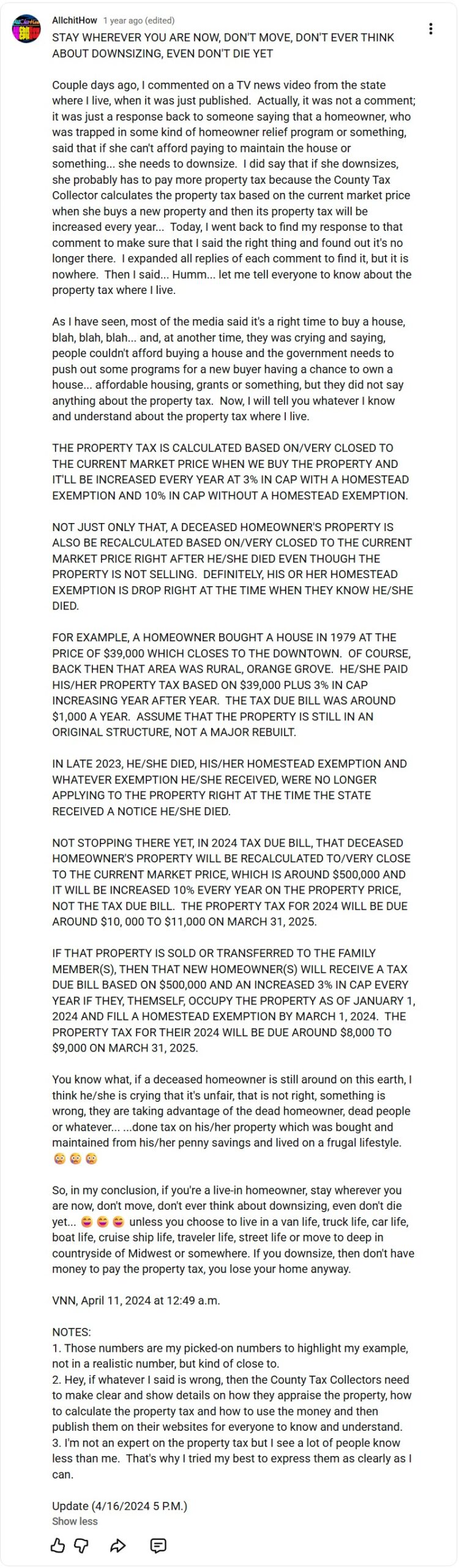 STAY WHEREVER YOU ARE NOW, DON’T MOVE, DON’T EVER THINK ABOUT DOWNSIZING, EVEN DON’T DIE YET Couple days ago, I commented on a TV news video from the state where I live, when it was just published. Actually, it was not a comment; it was just a response back to someone saying that a homeowner, … Continue reading STAY WHEREVER YOU ARE | Property Taxes