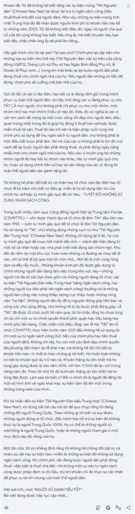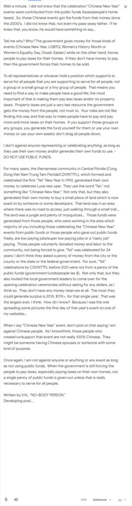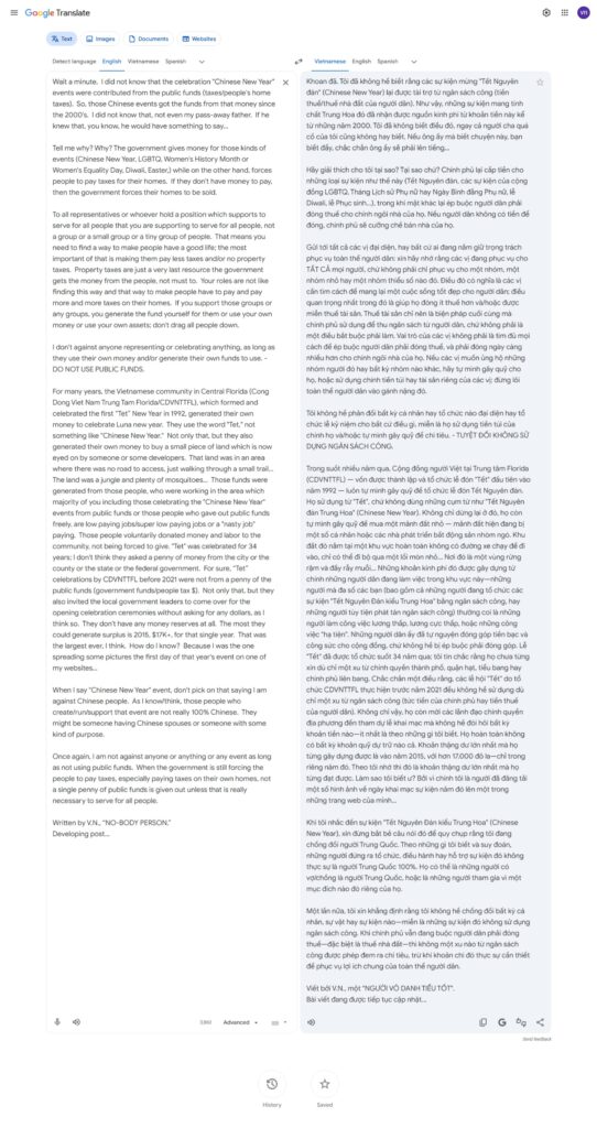 Trong suốt nhiều năm qua, Cộng đồng người Việt tại Trung tâm Florida (CDVNTTFL) — vốn được thành lập và tổ chức lễ đón “Tết” đầu tiên vào năm 1992 — luôn tự mình gây quỹ để tổ chức lễ đón Tết Nguyên đán. Họ sử dụng từ “Tết”, chứ không dùng những cụm từ như “Tết Nguyên đán Trung Hoa” (Chinese New Year). Không chỉ dừng lại ở đó, họ còn tự mình gây quỹ để mua một mảnh đất nhỏ — mảnh đất hiện đang bị một số cá nhân hoặc các nhà phát triển bất động sản nhòm ngó. Khu đất đó nằm tại một khu vực hoàn toàn không có đường xe chạy để đi vào, chỉ có thể đi bộ qua một lối mòn nhỏ… Nơi đó là một vùng rừng rậm và đầy rẫy muỗi… Những khoản kinh phí đó được gây dựng từ chính những người dân đang làm việc trong khu vực này—những người mà đa số các bạn (bao gồm cả những người đang tổ chức các sự kiện “Tết Nguyên Đán kiểu Trung Hoa” bằng ngân sách công, hay những người tùy tiện phát tán ngân sách công) thường coi là những người làm công việc lương thấp, lương cực thấp, hoặc những công việc “hạ tiện”. Những người dân ấy đã tự nguyện đóng góp tiền bạc và công sức cho cộng đồng, chứ không hề bị ép buộc phải đóng góp. Lễ “Tết” đã được tổ chức suốt 34 năm qua; tôi tin chắc rằng họ chưa từng xin dù chỉ một xu từ chính quyền thành phố, quận hạt, tiểu bang hay chính phủ liên bang. Chắc chắn một điều rằng, các lễ hội “Tết” do tổ chức CDVNTTFL thực hiện trước năm 2021 đều không hề sử dụng dù chỉ một xu từ ngân sách công (tức tiền của chính phủ hay tiền thuế của người dân). Không chỉ vậy, họ còn mời các lãnh đạo chính quyền địa phương đến tham dự lễ khai mạc mà không hề đòi hỏi bất kỳ khoản tiền nào—ít nhất là theo những gì tôi biết. Họ hoàn toàn không có bất kỳ khoản quỹ dự trữ nào cả. Khoản thặng dư lớn nhất mà họ từng gây dựng được là vào năm 2015, với hơn 17.000 đô la—chỉ trong riêng năm đó. Theo tôi nhớ thì đó là khoản thặng dư lớn nhất mà họ từng đạt được. Làm sao tôi biết ư? Bởi vì chính tôi là người đã đăng tải một số hình ảnh về ngày khai mạc sự kiện năm đó lên một trong những trang web của mình…