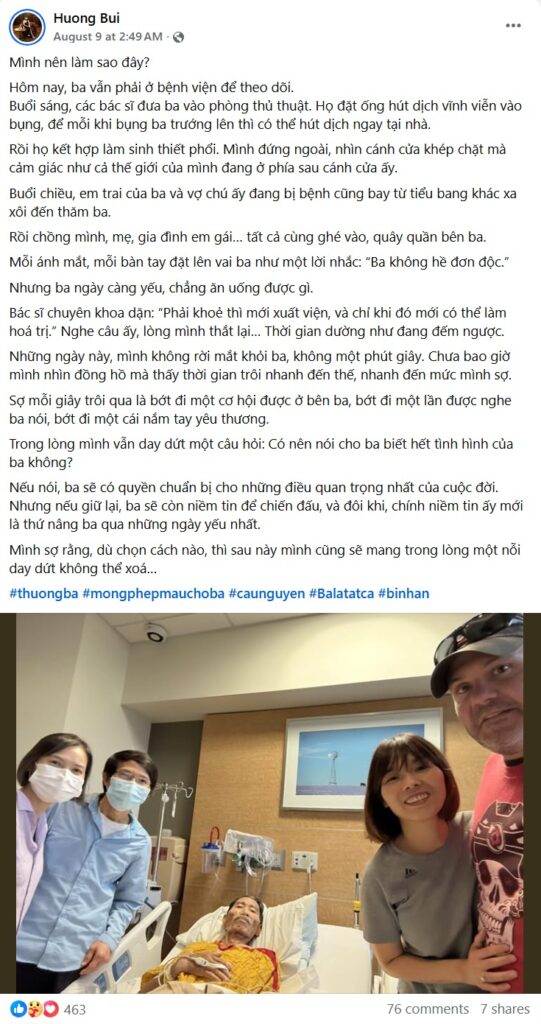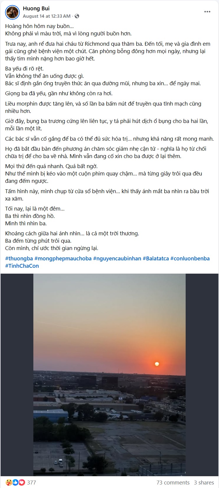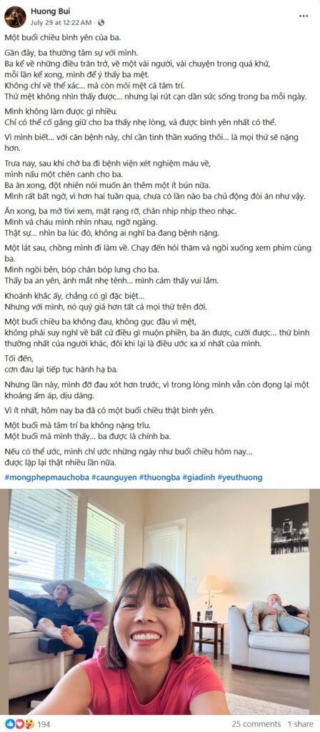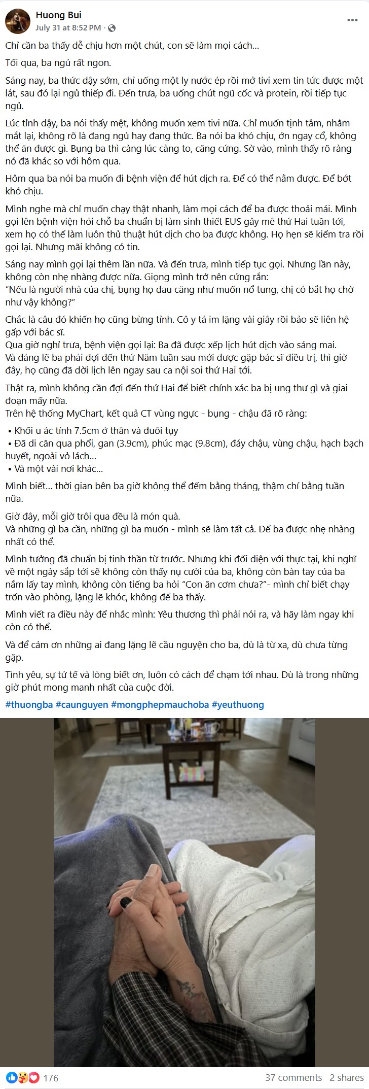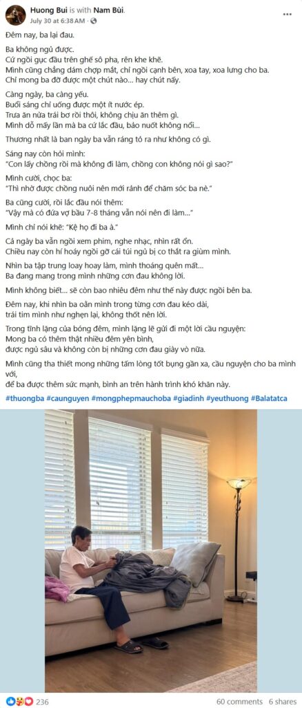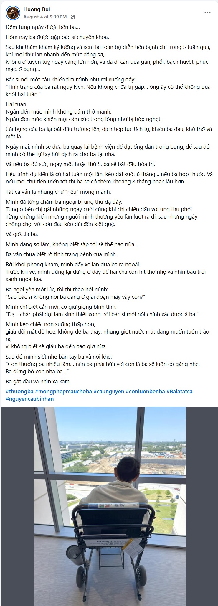 Để đọc bài viết tâm sự của Huong Bui về bệnh tình của người cha thì hãy bấm lên hình rồi bấm phóng lớn lên đọc. Tất cả các bài viết được sắp xếp từ cũ đến mới nhất. Còn muốn đọc thẳng hay follow Huong Bui thì dùng một trong những đường link của mỗi bài viết mà vào trang chính của Huong.