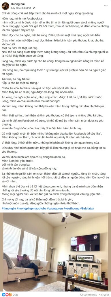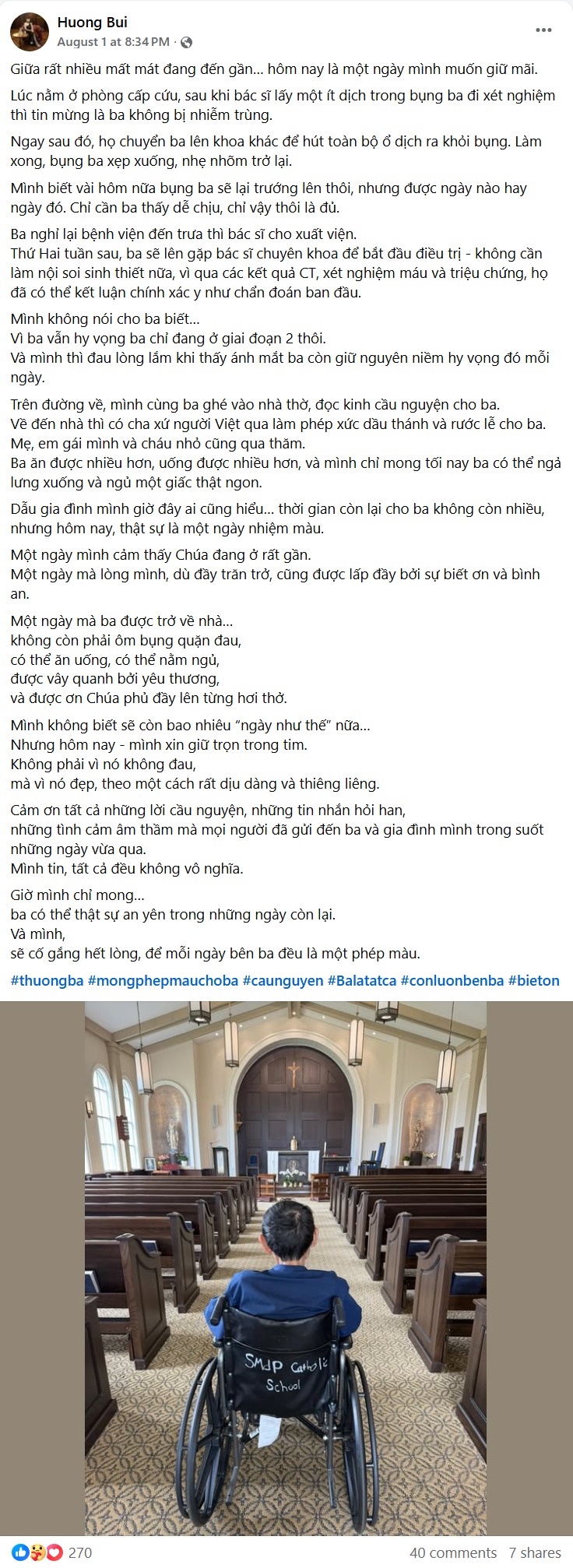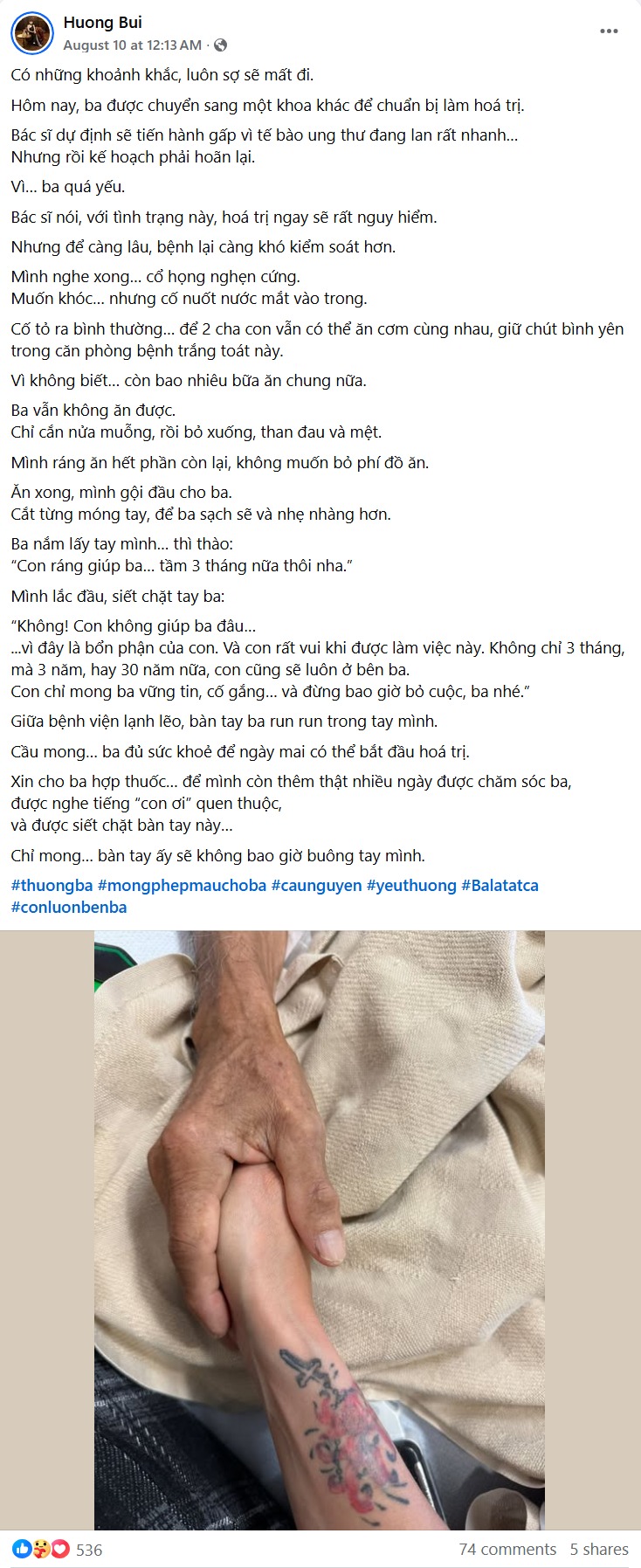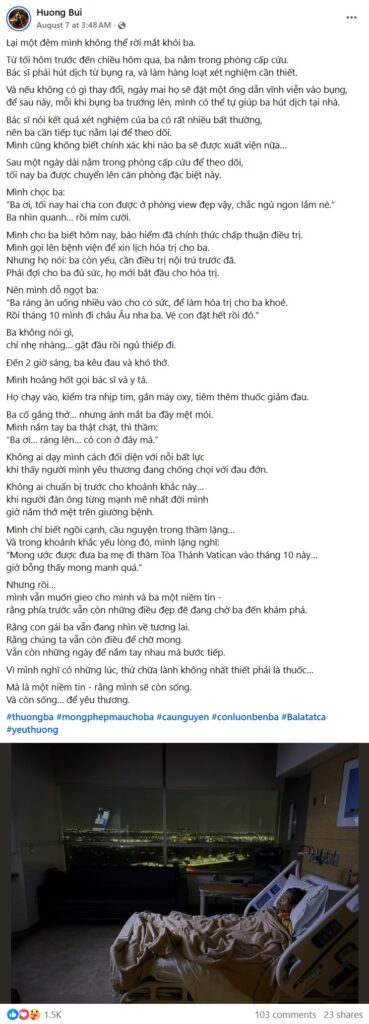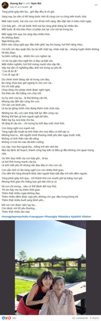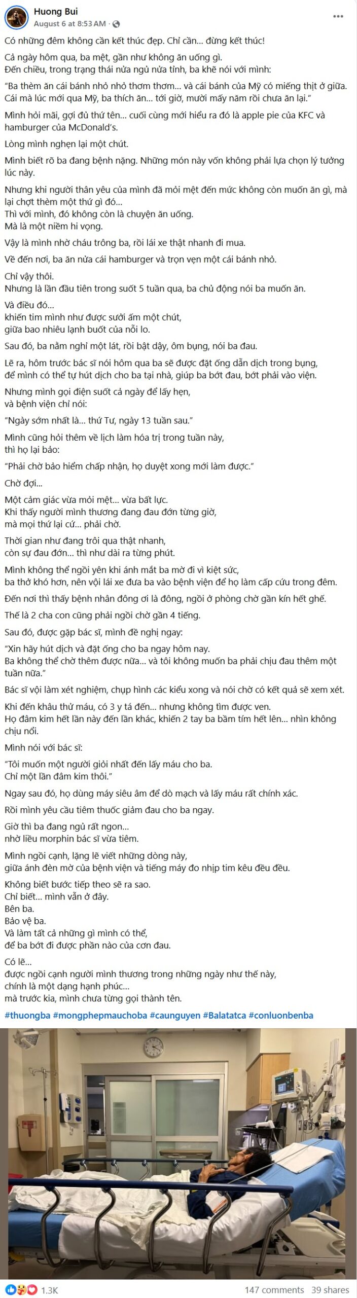 Để đọc bài viết tâm sự của Huong Bui về bệnh tình của người cha thì hãy bấm lên hình rồi bấm phóng lớn lên đọc. Tất cả các bài viết được sắp xếp từ cũ đến mới nhất. Còn muốn đọc thẳng hay follow Huong Bui thì dùng một trong những đường link của mỗi bài viết mà vào trang chính của Huong.