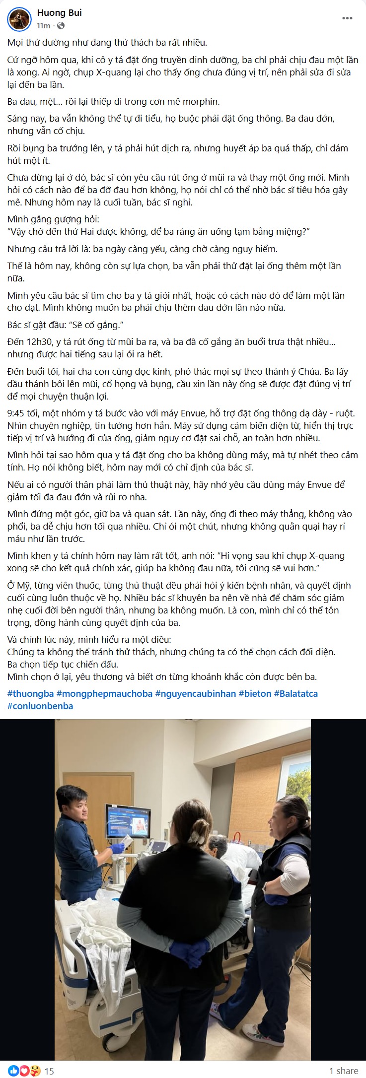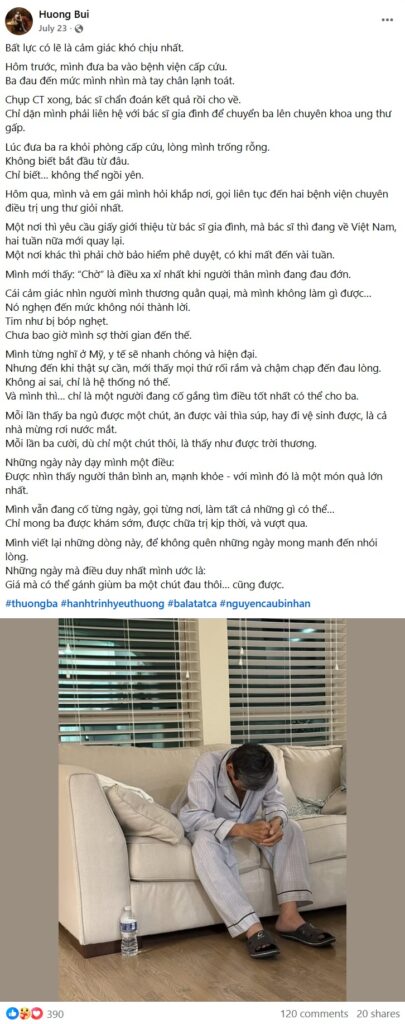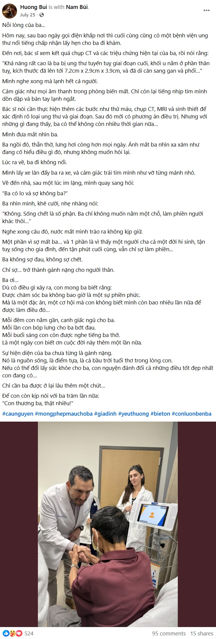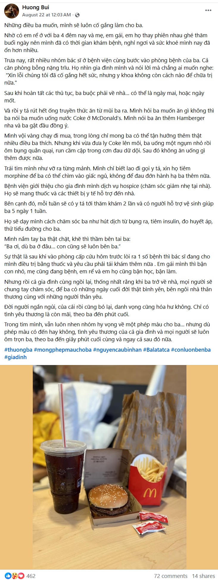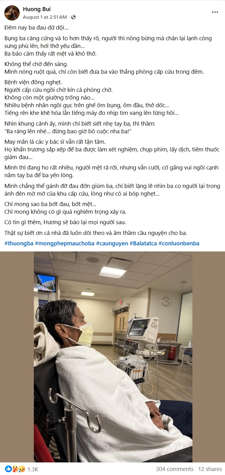 Để đọc bài viết tâm sự của Huong Bui về bệnh tình của người cha thì hãy bấm lên hình rồi bấm phóng lớn lên đọc. Tất cả các bài viết được sắp xếp từ cũ đến mới nhất. Còn muốn đọc thẳng hay follow Huong Bui thì dùng một trong những đường link của mỗi bài viết mà vào trang chính của Huong.