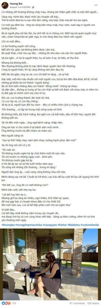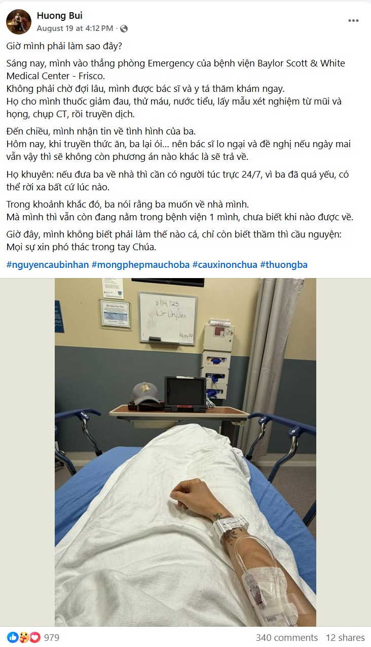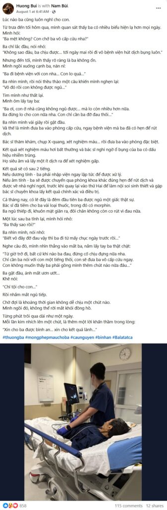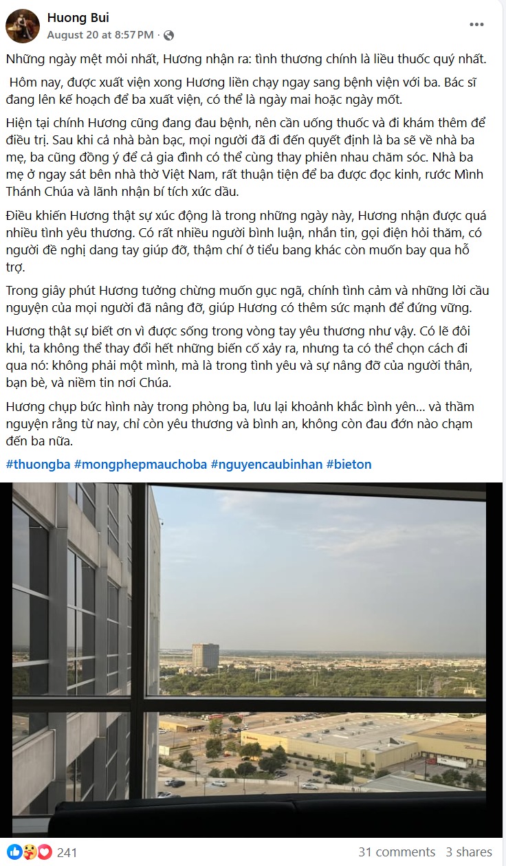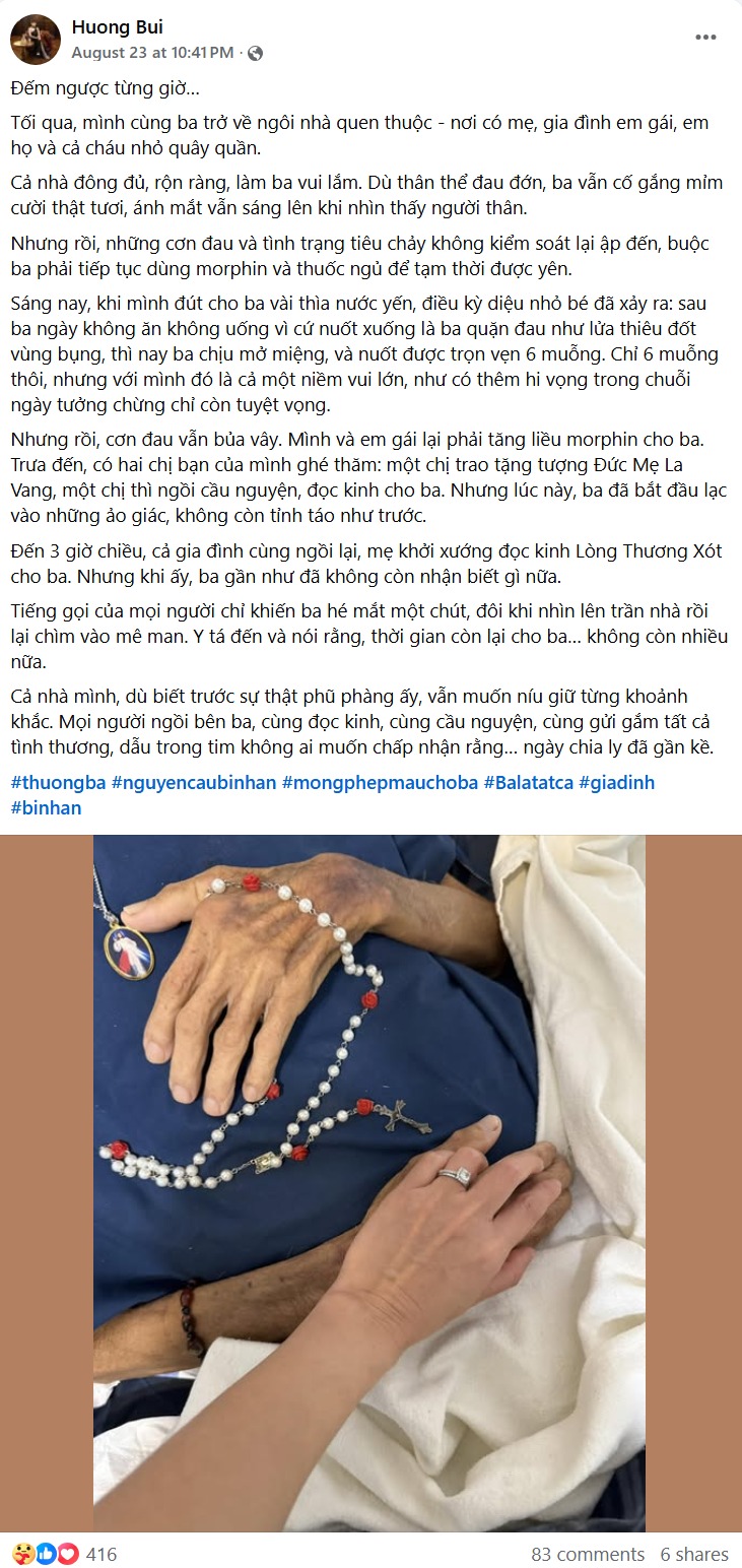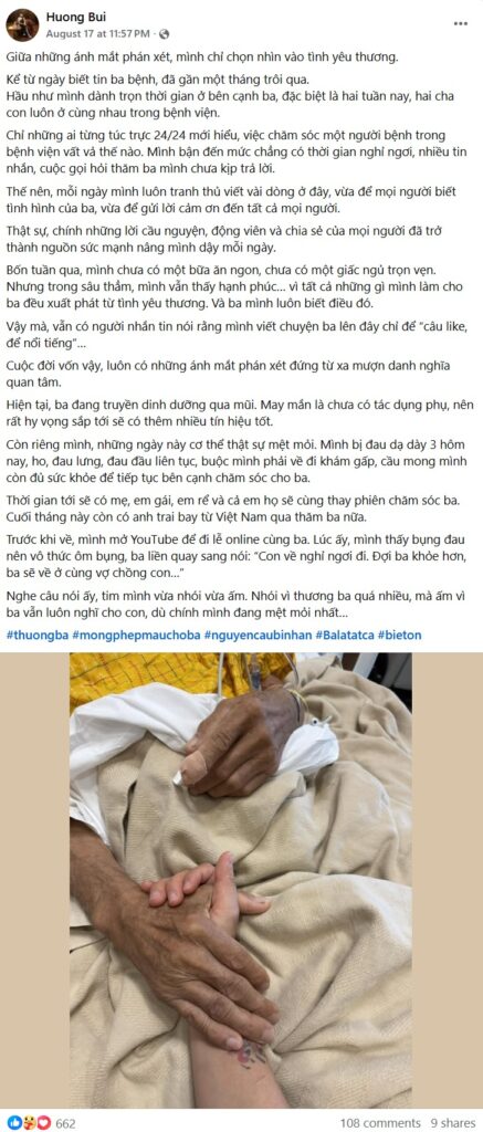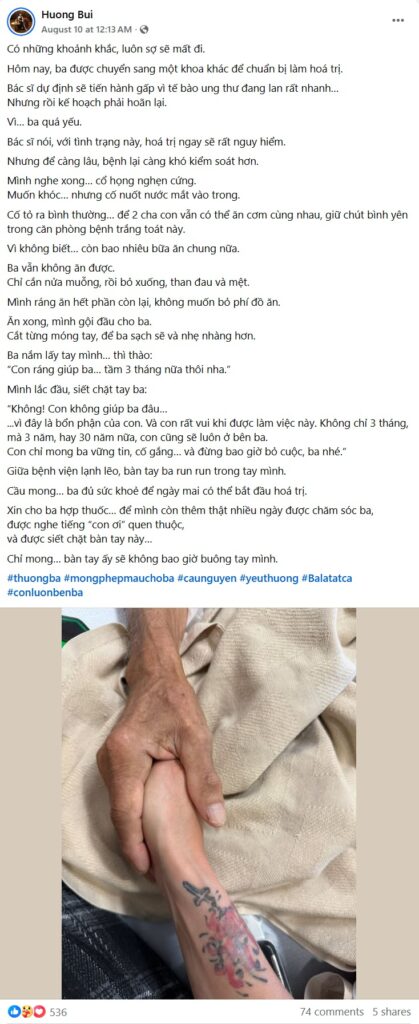 Để đọc bài viết tâm sự của Huong Bui về bệnh tình của người cha thì hãy bấm lên hình rồi bấm phóng lớn lên đọc. Tất cả các bài viết được sắp xếp từ cũ đến mới nhất. Còn muốn đọc thẳng hay follow Huong Bui thì dùng một trong những đường link của mỗi bài viết mà vào trang chính của Huong.